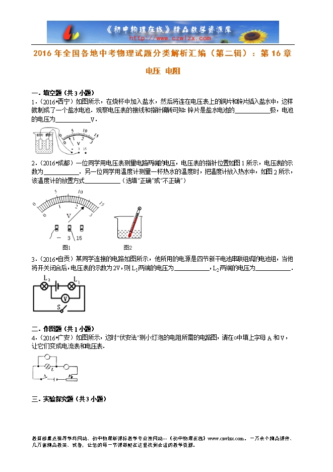 2016年全国各地中考物理试题分类解析汇编(第二辑):第16章 电压 电阻