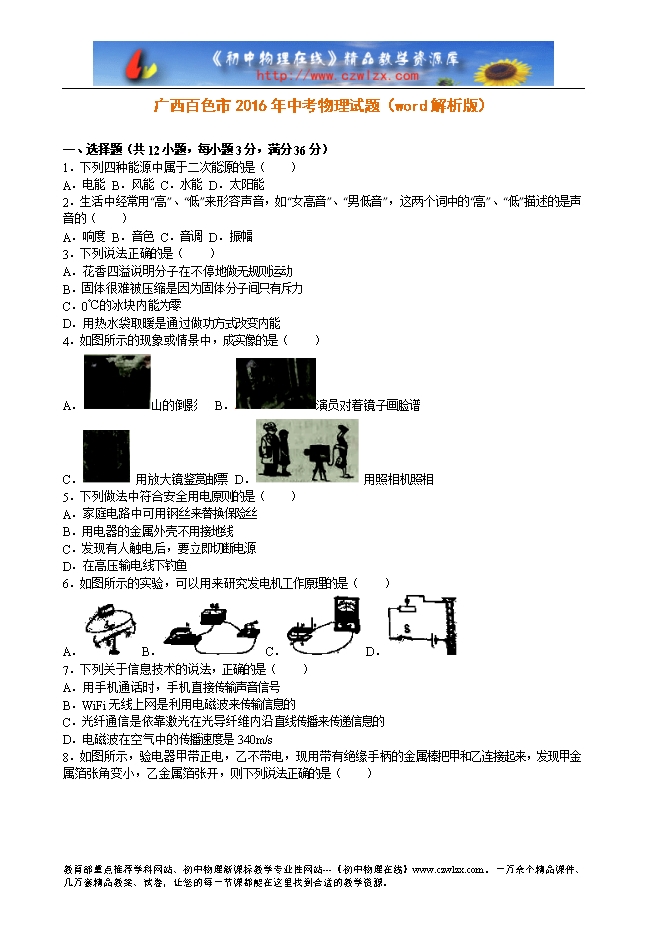 广西百色市2016年中考物理试题(word解析版)