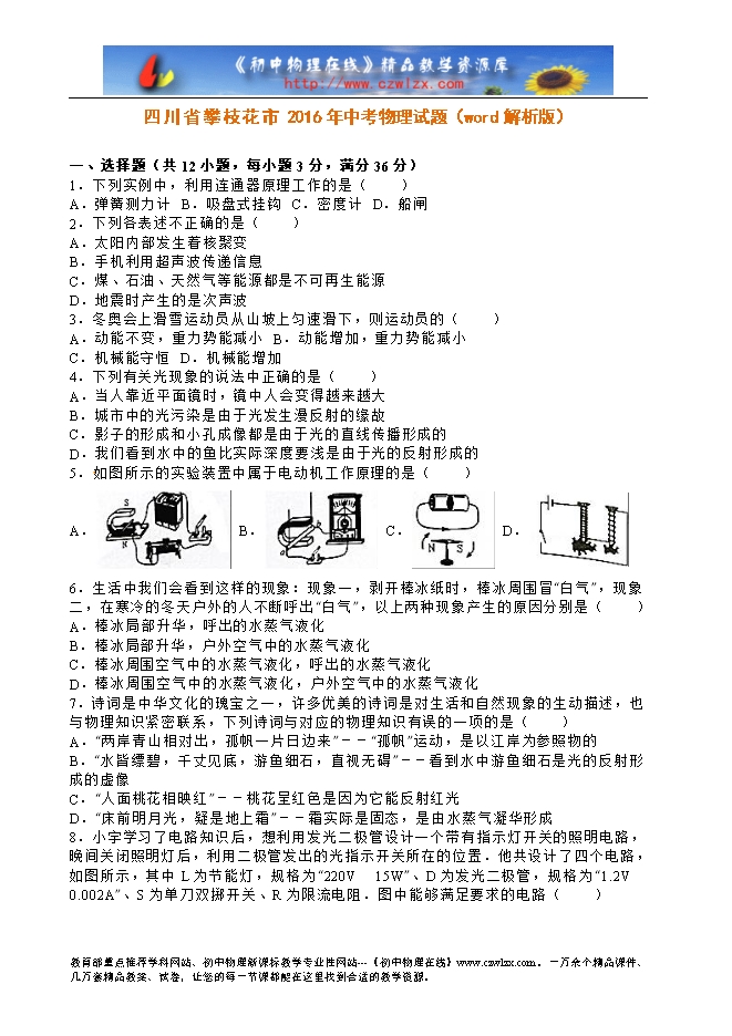 四川省攀枝花市2016年中考物理试题(word解析版)