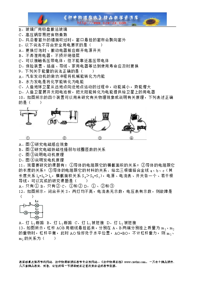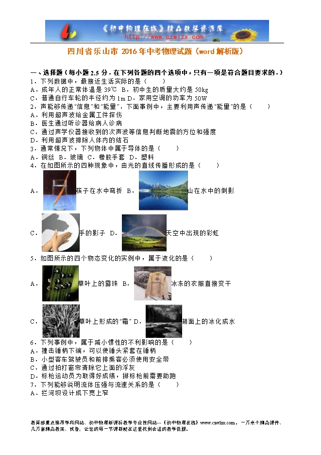 四川省乐山市2016年中考物理试题(word解析版)