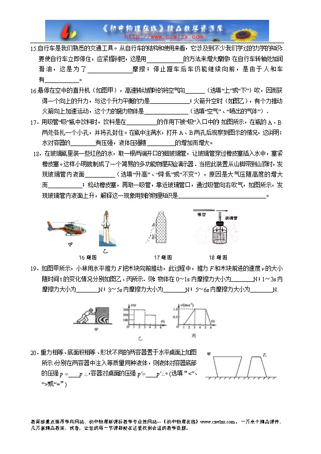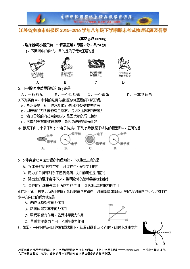 江苏省南京市鼓楼区2015-2016学年八年级下学期期末考试物理试题及答案
