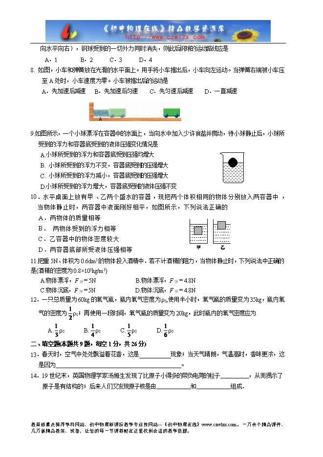 8. 如 图,小车和弹簧放在光滑的水平面上。用手将小车推出后,小车向左运动。当弹簧右端被小车压至A处时,小车速度为零。小车被推出后的运动是