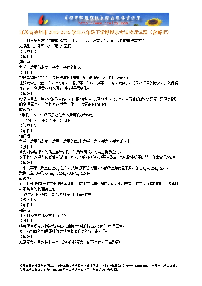 【内容简介】1 一根质量分布均匀的铅笔芯,用去一半后,没有发生明显变化的物理量是它的