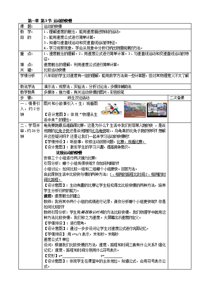 2016年人教版物理八年级上册(新)第一章 第3节 运动的快慢 教案