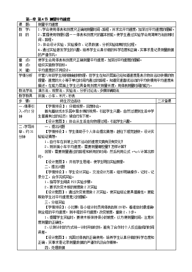 学情分析 尽管八年级学生刚刚接触到物理,但学生在知识层面已经知道速度是表示物体运动快慢的物理量,速度的大小等于单位时间内通过的路程。知道变速直线运动的平均快慢用平均速度来描述。在能力层面上学生已具备用刻度尺测量长度,用停表测量时间的能力。