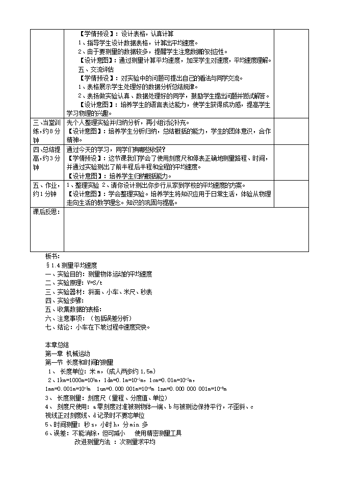2016年人教版物理八年级上册(新)第一章 第4节 测量平均速度 教案