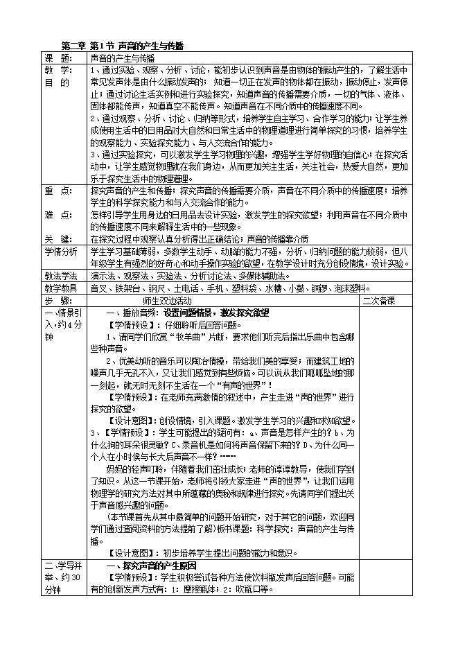 关 键: 探究声音的产生和传播;探究声音的传播需要介质,声音在不同介质中的传播速度;培养学生的科学探究能力和与人交流合作的能力。