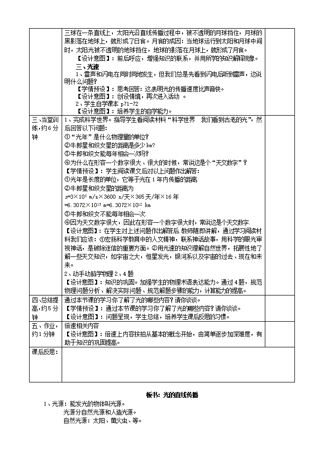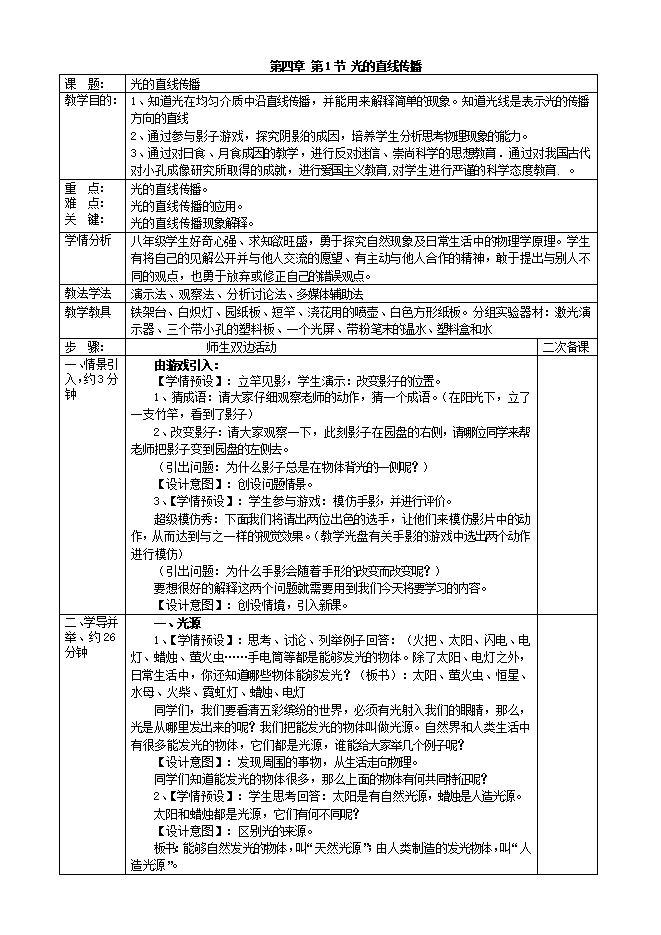 教学目的: 1、知道光在均匀介质中沿直线传播,并能用来解释简单的现象。知道光线是表示光的传播方向的直线