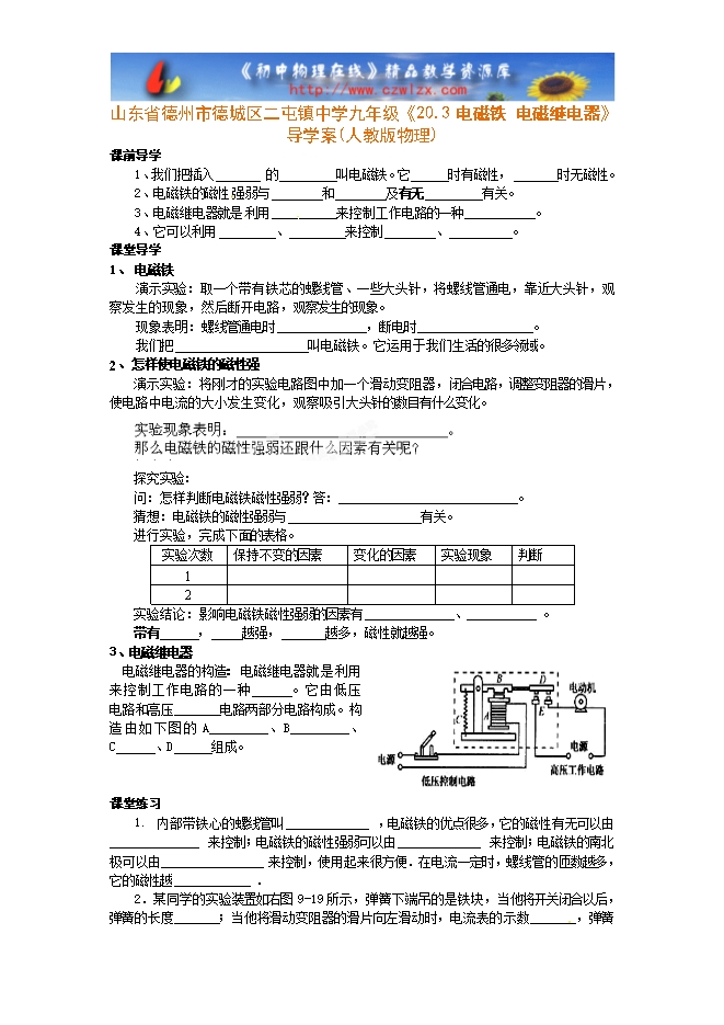 山东省德州市德城区二屯镇中学九年级《20.3电磁铁 电磁继电器》导学案(人教版物理)