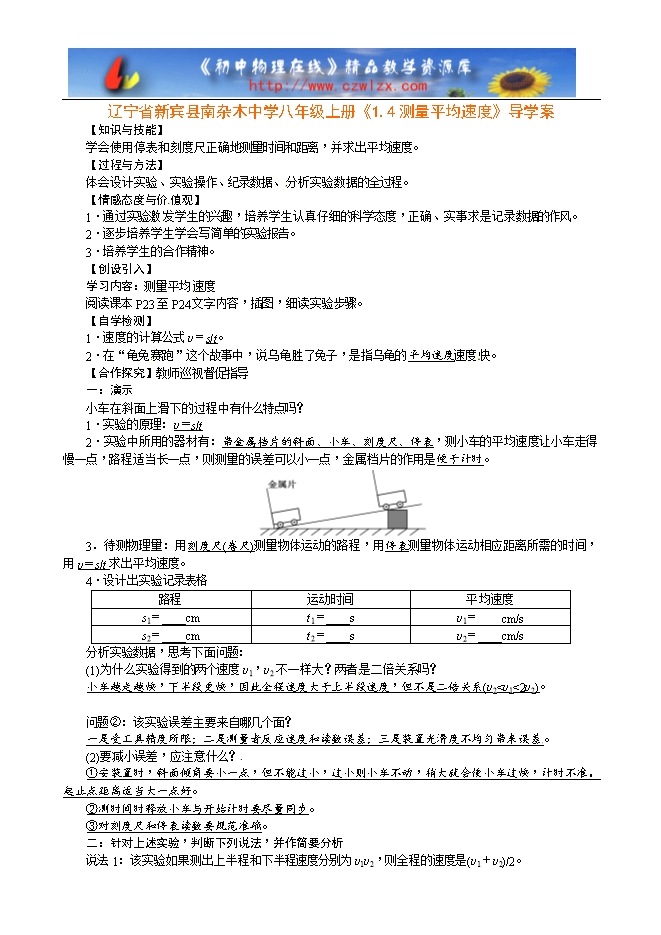 辽宁省新宾县南杂木中学八年级上册《1.4测量平均速度》导学案