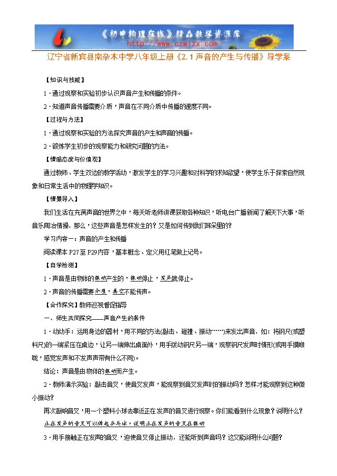 辽宁省新宾县南杂木中学八年级上册《2.1声音的产生与传播》导学案