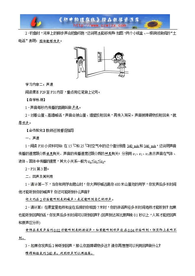 2.知道声音传播需要介 质,声音在不同介质中传播的速度不同。