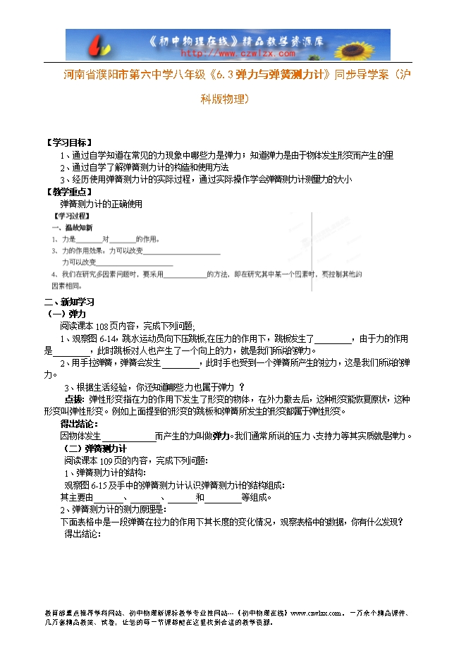 河南省濮阳市第六中学八年级《6.3弹力与弹簧测力计》同步导学案(沪科版物理)