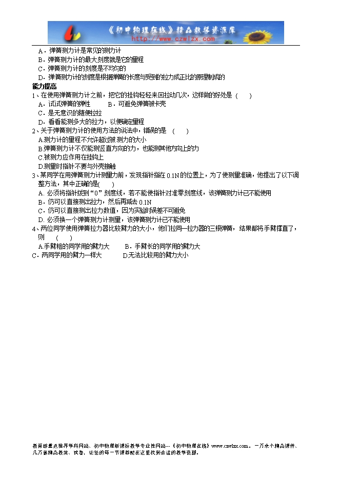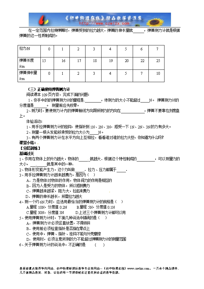 3、经历使用弹簧测力计的实际过程,通过实际操作学会弹簧测力计测量力的大小