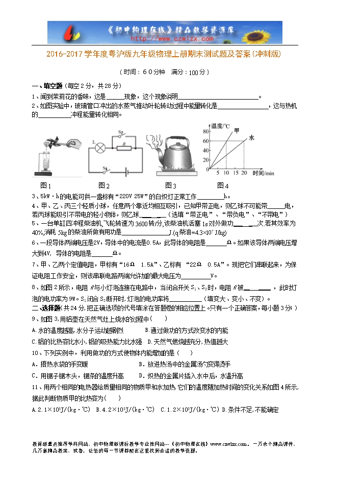 2016-2017学年度粤沪版九年级物理上册期末测试题及答案(冲刺版)