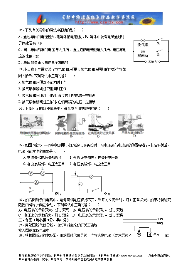 6、一段导体两端电压是2V,导体中的电流是0.5A,此导体的电阻是 Ω。如果该导体两端电压增大到4V, 导体的电阻是 Ω。
