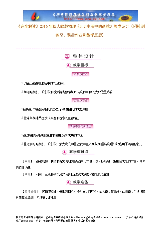 《完全解读》2016年秋人教版物理《5.2生活中的透镜》教学设计(附检测练习、课后作业和教学反思)