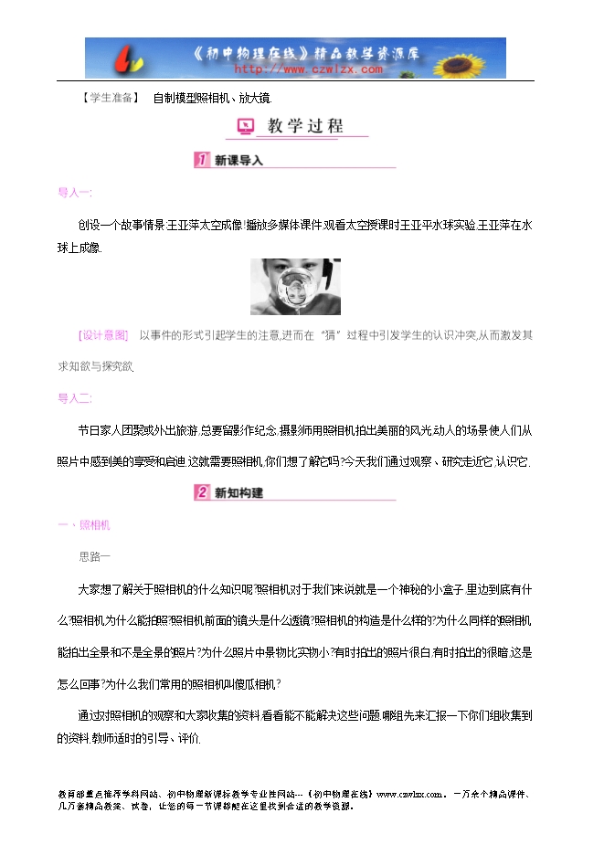 【教师准备】 实物照相机、模型照相机、投影仪、幻灯机、放大镜、硬纸板、凸透镜、半透明塑料薄膜或蜡纸、毛玻璃、课件等.
