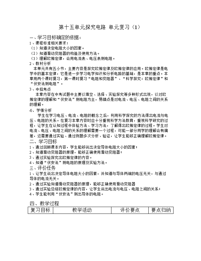 本单元共有五小节,主要内容是探究欧姆定律及欧姆定律的应用。欧姆定律是电学中的基本定律,它是进一步学习电学知识和分析电路的基础,是本章的重点。本章用两个课时复习,第一课时复习“电阻和变阻器”、“科学探究:欧姆定律”和“伏安法测电阻”。
