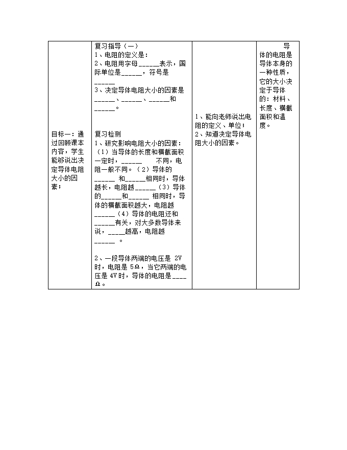 1、通过回顾课本内容,学生能够说出决定导体电阻大小的因素;