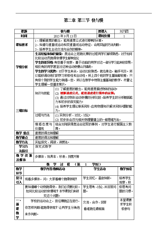 学生的差异性:有些善于观察,善于动脑的同学对这一部分学习起来较容易,相反有的同学甚至对这种运动快慢认识错误。