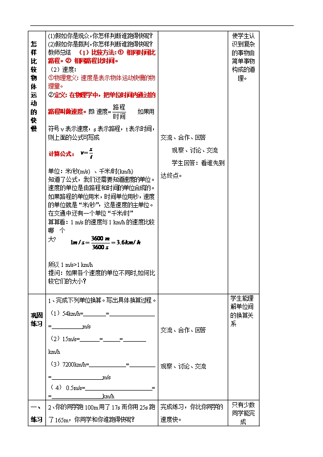 (3) 通过对物体运动快慢的分析比较,培养学生的分析概括能力和初步的探究能力;