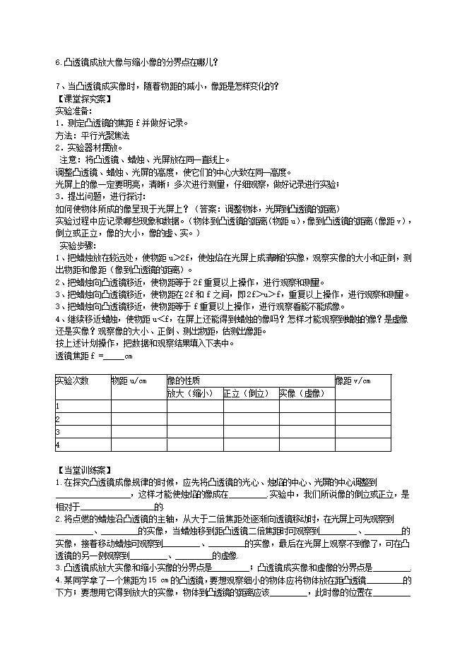 3.通过对凸透镜成像现象的观察分析,总结出凸透镜成像规律,并用列表的方法归纳出凸透镜成放大或缩小、正立或倒立、实像或虚像的条件.培养从物理现象中归纳科学规律的方法.