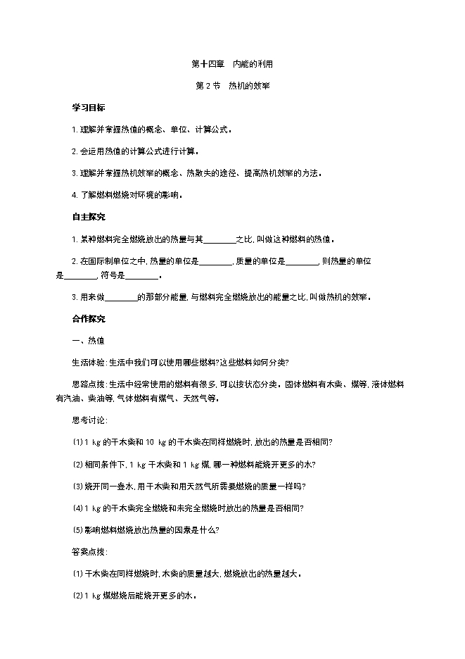 人教版九年级物理全册精品教学案:第十四章内能的利用第2节 热机的效率(答案含解析)