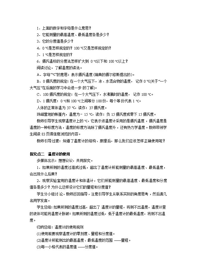 学生活动:带着问题观察实验室用温度计并阅读课本