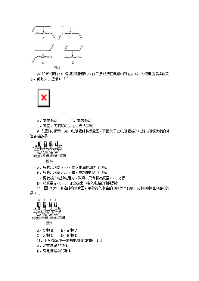 7.图14,A、B、C、D中所示的为滑线变阻器的结构和连入电路情况示意图,当滑片向右滑动时,连入电路的电阻变小的为[]