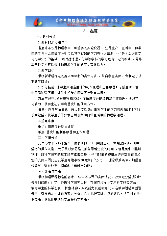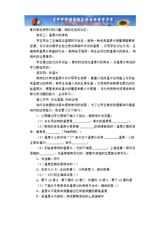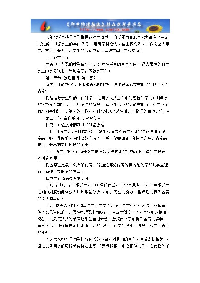 温度计不仅是物理学中一种重要的实验仪器,还是生产、生活中一种常用的工具。会用温度计对今后其它仪器的学习有很大帮助,也是今后继续学习热学知识的基础,同时对地理、化学等学科的学习也有一定的帮助。另外本节教学内容能很好地培养学生的观察、实验能力。