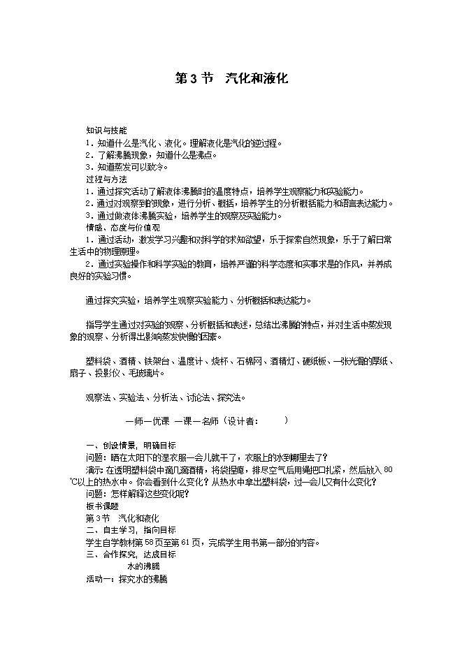 2016秋人教版八年级物理上册教案:3.3汽化和液化