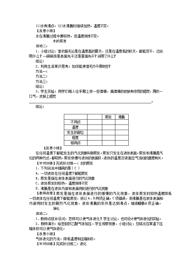 指导学生通过对实验的观察、分析概括和表述,总结出沸腾的特点,并对生活中蒸发现象的观察、分析得出影响蒸发快慢的因素。