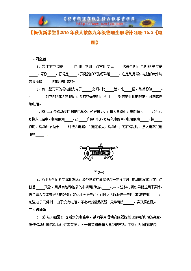 【畅优新课堂】2016年秋人教版九年级物理全册增补习题:16.3《电阻》