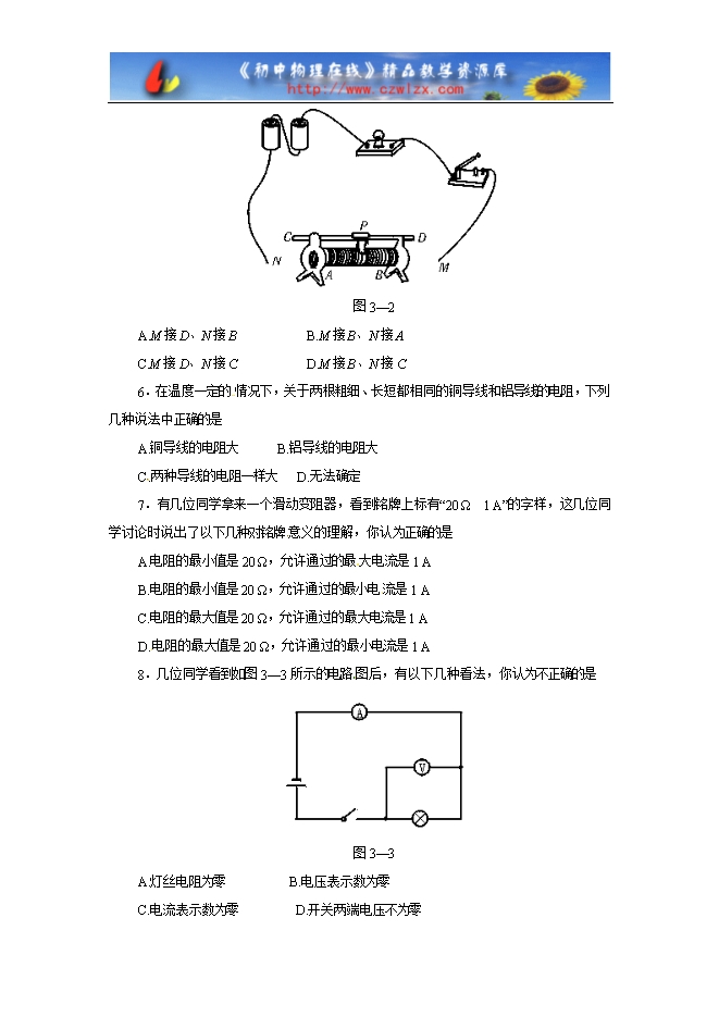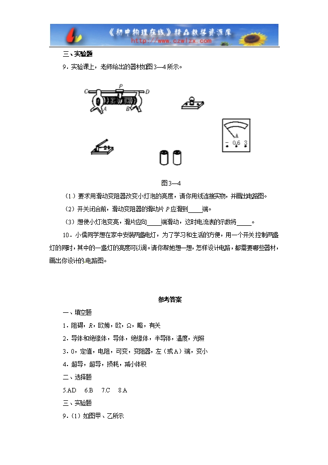 3.图3—1是滑动变阻器的示意图,如果将C、D接入电路中,电阻值为_____;将A、B接入电路中,电阻值为_____,起_____作用;将B、D接入电路中,电阻值为_____,起_____作用,滑动片P位于_____时接入电路中的电阻最大,滑动片P向右滑动时,接入电路的电阻将_____。