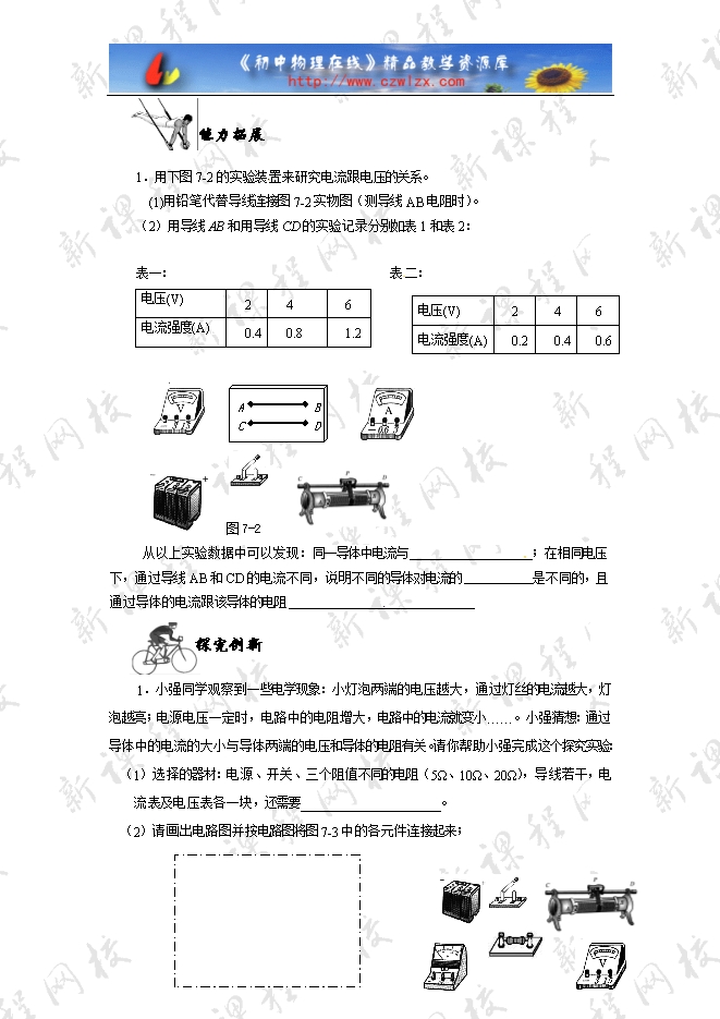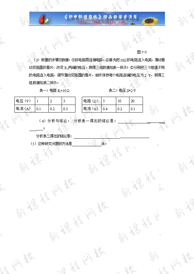 3. 如图7-1所示是研究电流与电压、电阻的关系的电路图,实验分“保持电阻不变”和“保持电压不变”两步进行。在“保持电阻不变”这一步实验时应( )