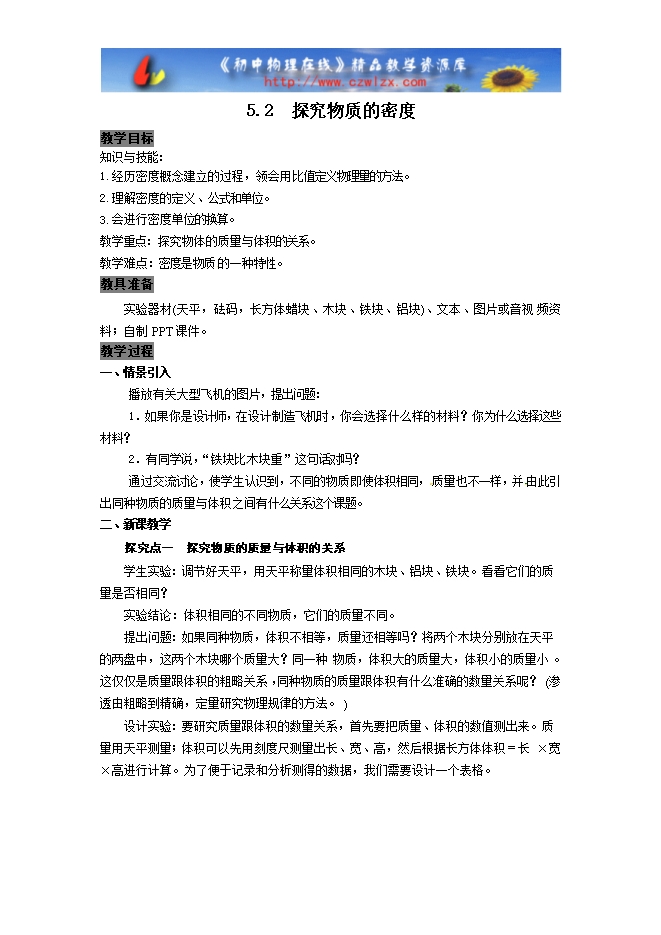 物理(沪粤版)八年级上册教案:5.2探究物质的密度
