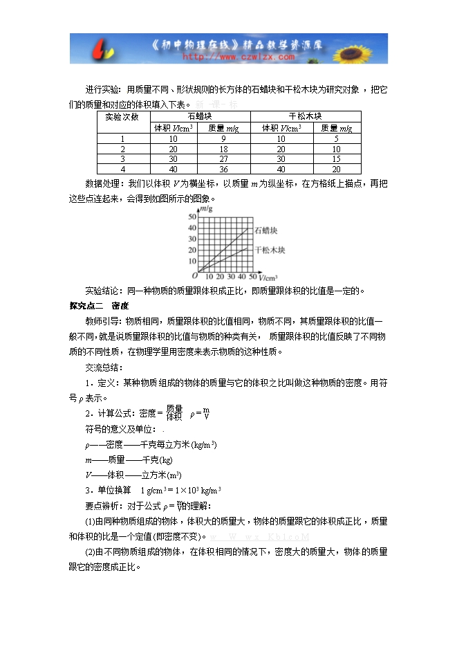 通过交流讨论,使学生认识到,不同的物质即使体积相同, 质量也不一样,并 由此引出同种物质的质量与体积之间有什么关系这个课题。