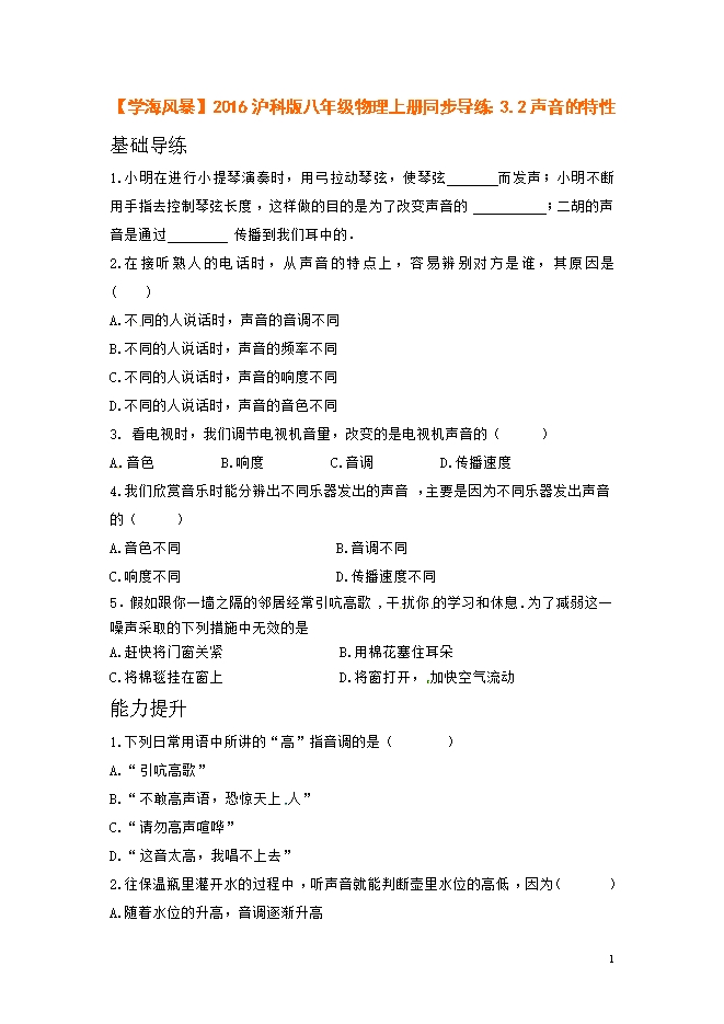 【学海风暴】2016沪科版八年级物理上册同步导练:3.2声音的特性