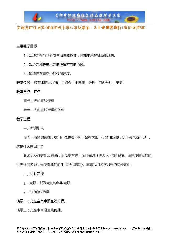 安徽省庐江县罗河镇初级中学八年级教案:3.1光世界巡行(粤沪版物理)
