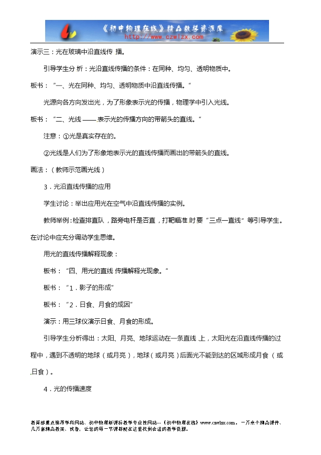 板书:“一、光在同种、均匀、透明物质中沿直线传播。”