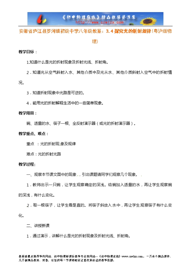 安徽省庐江县罗河镇初级中学八年级教案:3.4探究光的折射规律(粤沪版物理)