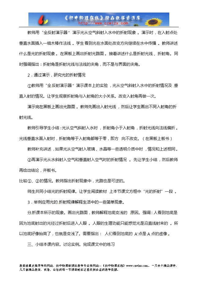 教师用“全反射演示器”演示光从空气斜射入水中的折射现象。演示时,在入射点处垂直水面插入一细木棒作法线。学生 看到光在水面处改变方向继续在水中传播。教师讲述什么是光的折射现象。在黑板上画出折射光路图。接着讲述什么是折射光线、折射角。同时强调指出:折射角是折射光线与法线的夹角,而不是与界面的夹角。