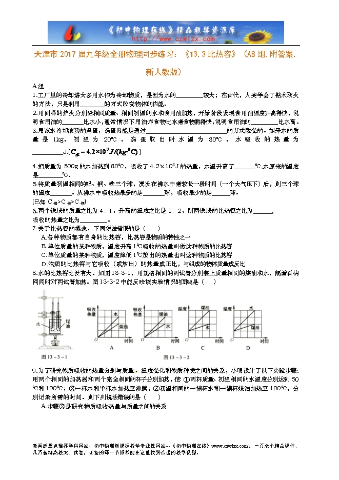 天津市2017届九年级全册物理同步练习:《13.3比热容》(AB组,附答案,新人教版)