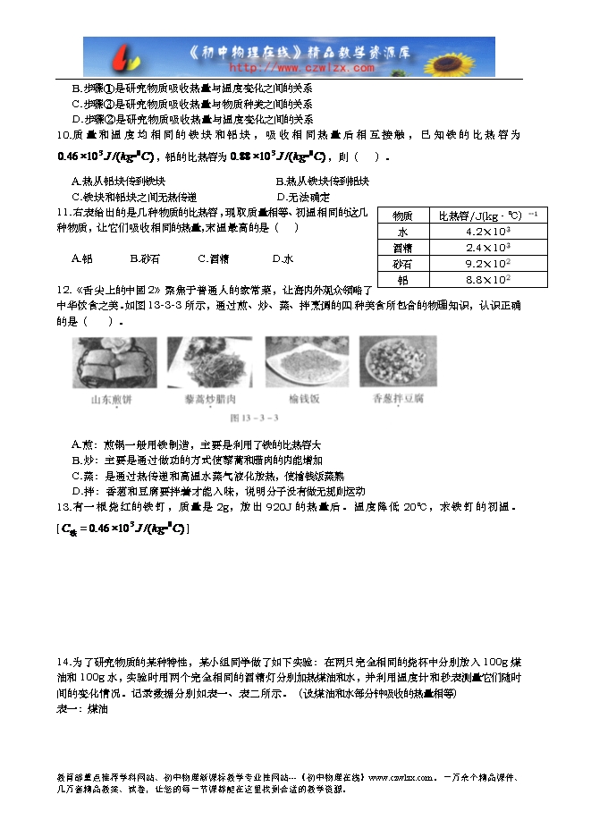 8.水的比热容比没有大。如图13-3-1,用规格相同的两试管分别装上质量相同的煤油和水,隔着石棉网同时对两试管加热。图13-3-2中能反映该实验情况的图线是( )