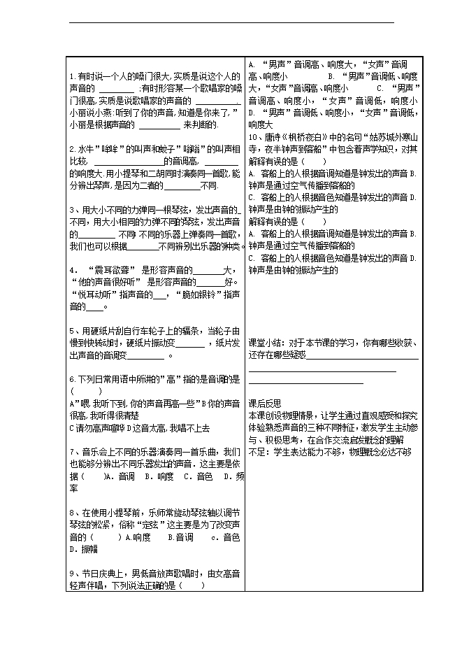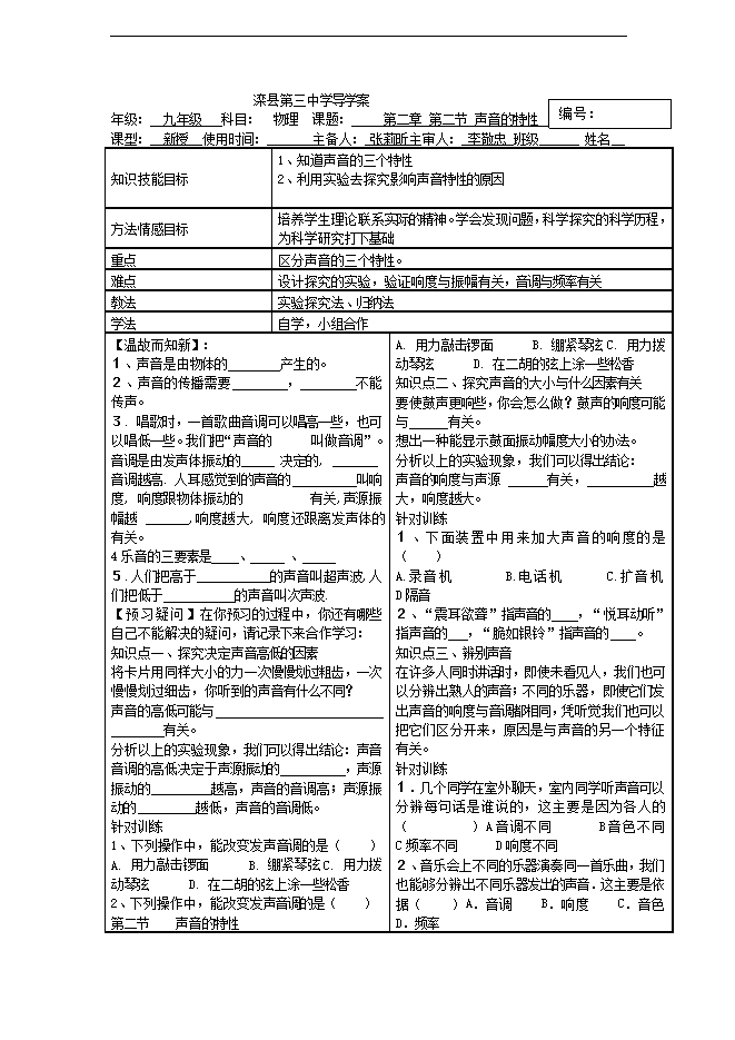 滦县第三中学八年级物理导学案:2.2声音的特性(无答案)