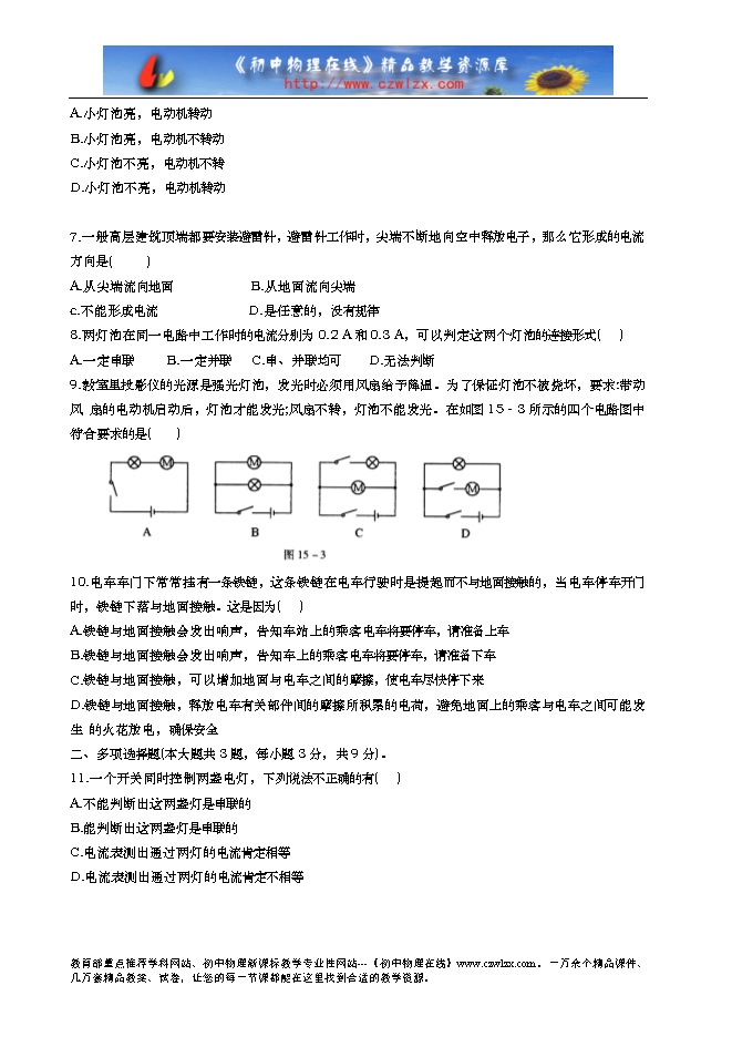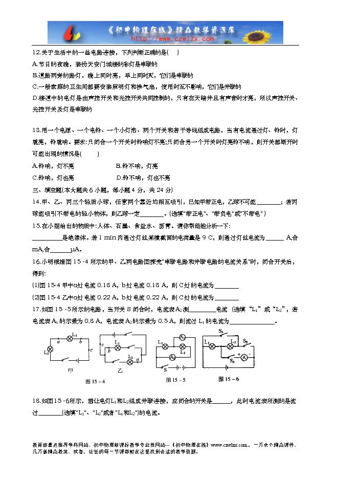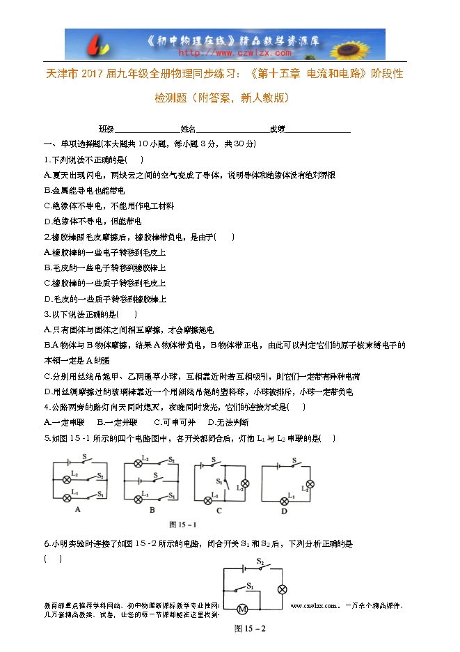 天津市2017届九年级全册物理同步练习:《第十五章 电流和电路》阶段性检测题(附答案,新人教版)
