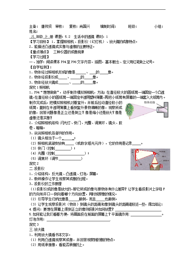 滦县第三中学八年级物理导学案:5.2生活中的透镜