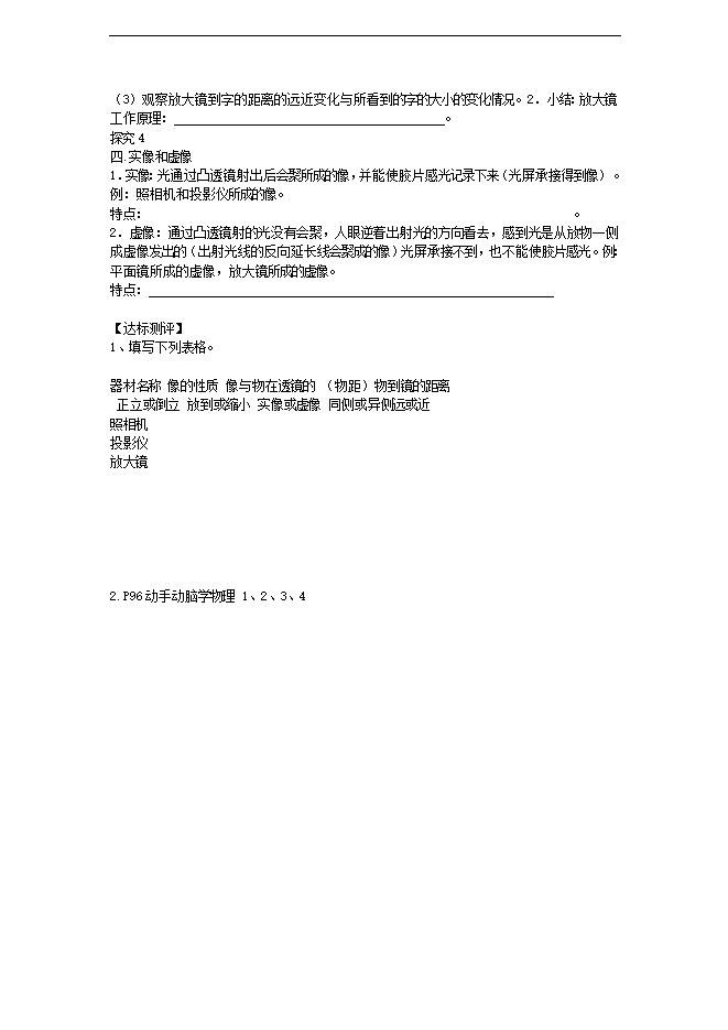 1.P94“想想做做”,动手制作模拟照相机,方法:在直径较大的圆纸筒一端固定一个凸透镜,在直径较小的圆纸筒一端固定半透明塑料薄膜,再把小纸筒有屏幕的一端套入大纸筒内。制作完成后,把模拟照相机对着室外,并前后拉动直径较小的纸筒,直到在半透明薄膜上看到室外景物清晰的像,观察所成的像,回答问题:像是正立还是倒立?像是缩小还是放大?像是虚像还是实像?