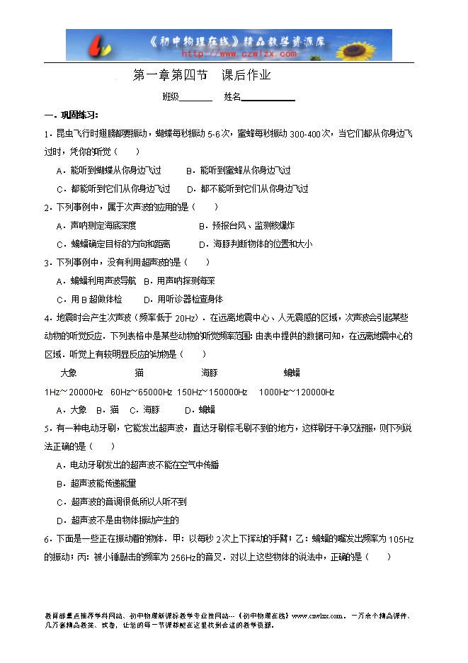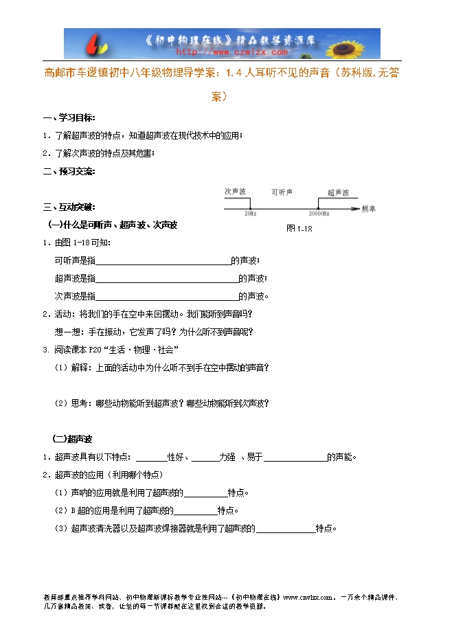 高邮市车逻镇初中八年级物理导学案:1.4人耳听不见的声音(苏科版,无答案)